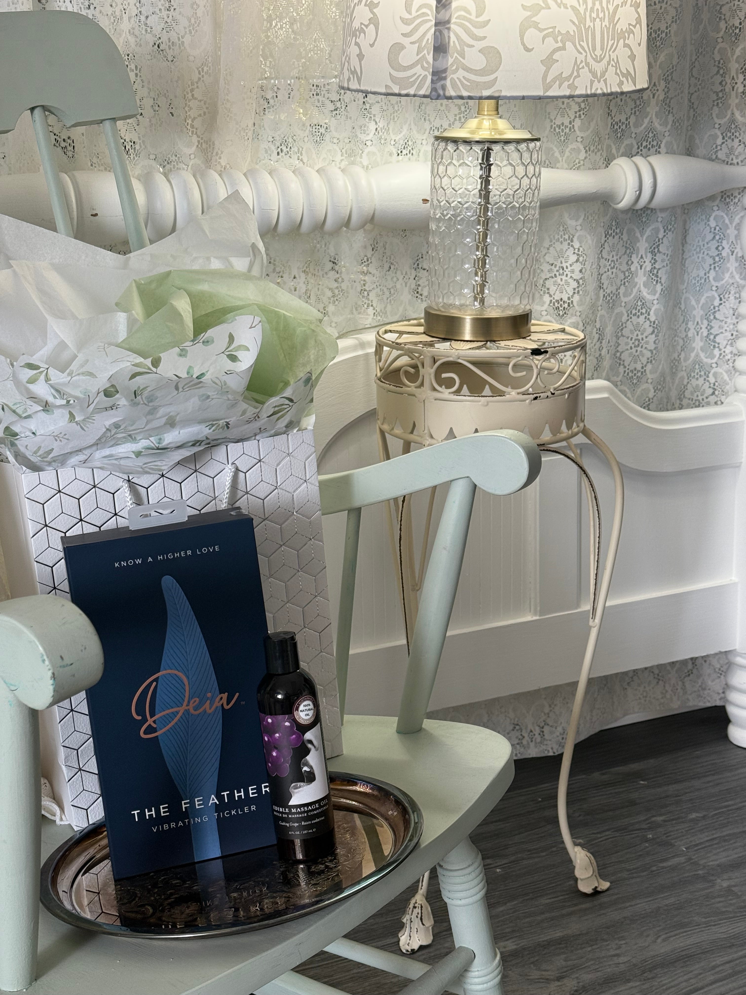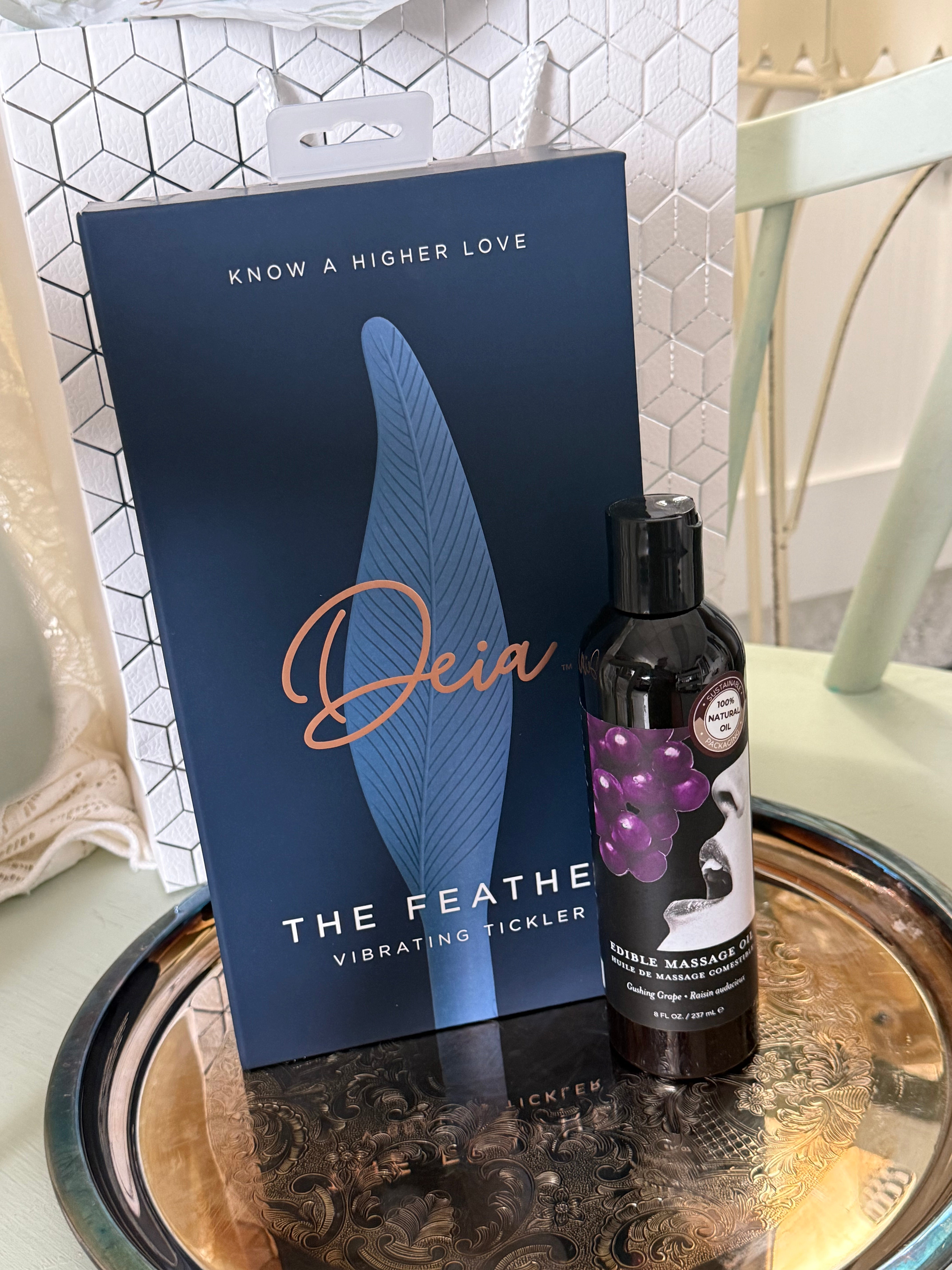 Tickle your senses with Deia’s Feather! You can tease, paint, tickle and vibe with this set. Includes 8 oz Edible Hemp Massage Oil. Great for the body, hair, and your bath!!!! Trust me…. You WANT THIS!!! Also, the Feather is waterproof with a 2 year warranty;)