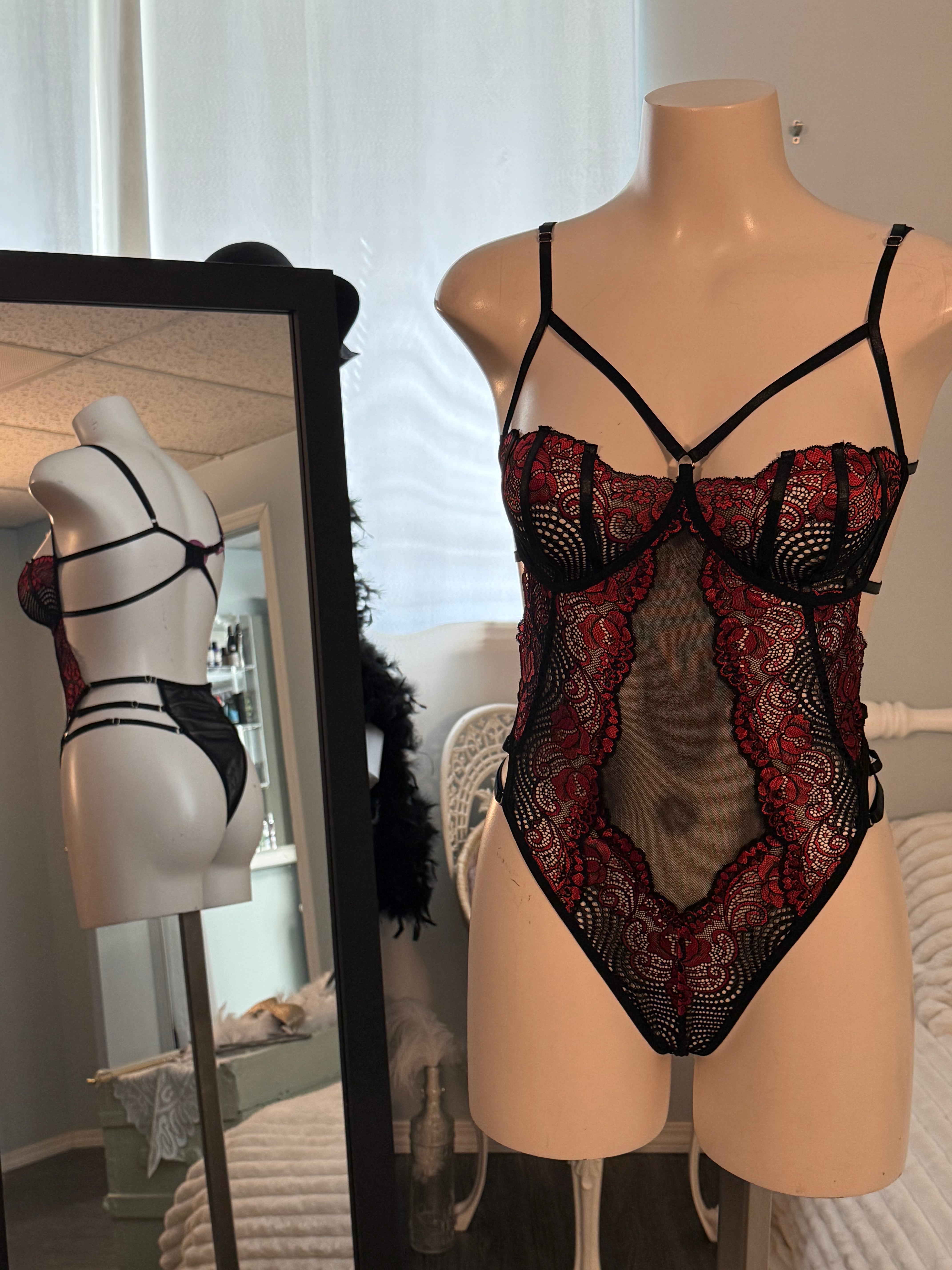 Anahi bodysuit. Black and red lace and straps
