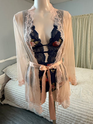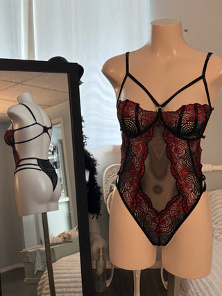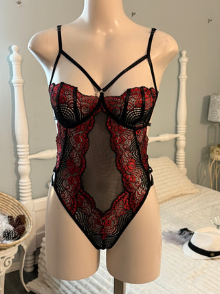 One size burgundy stretchy lace bodysuit with built in stockings, great to go over strappy outfits